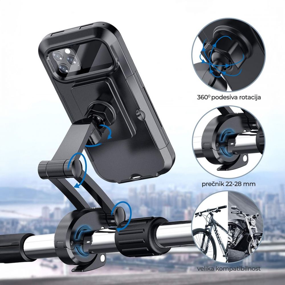 Kompatibilan sa uređajima od 4.5 do 7 inča, ovaj model nudi IPX4 zaštitu od prskanja vode, što znači da vaš telefon ostaje siguran čak i po kiši. Zahvaljujući 360° rotaciji, lako podešavate ugao ekrana za maksimalnu preglednost, dok osetljiv touch screen omogućava korišćenje svih funkcija bez otvaranja kućišta.